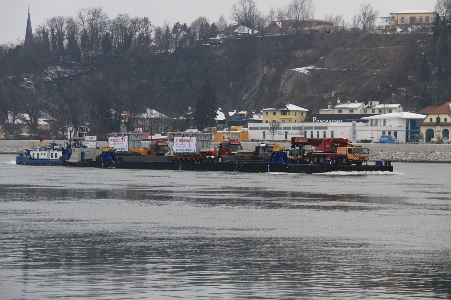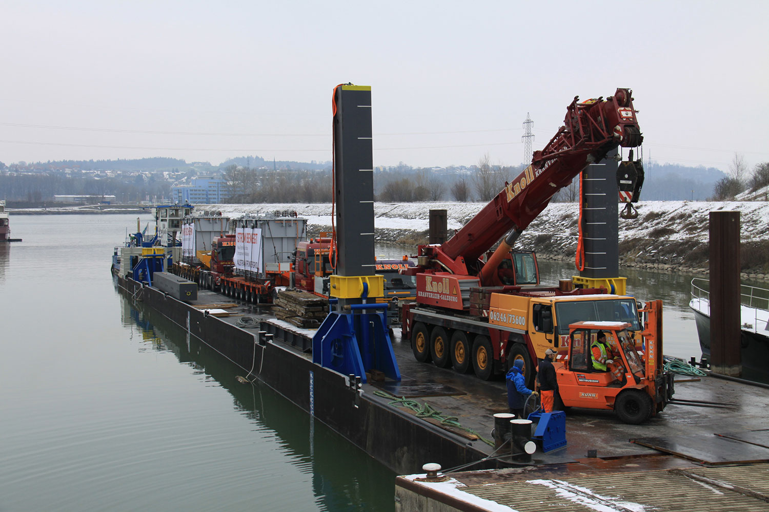For this order, we transported two power transformers together with a truck and a special mobile crane to a power plant island in the Danube. The special challenge: Due to the strong current, a special barge was used. The barge was able to support itself on the rivers ground and thus enabled us to load and unload safely.